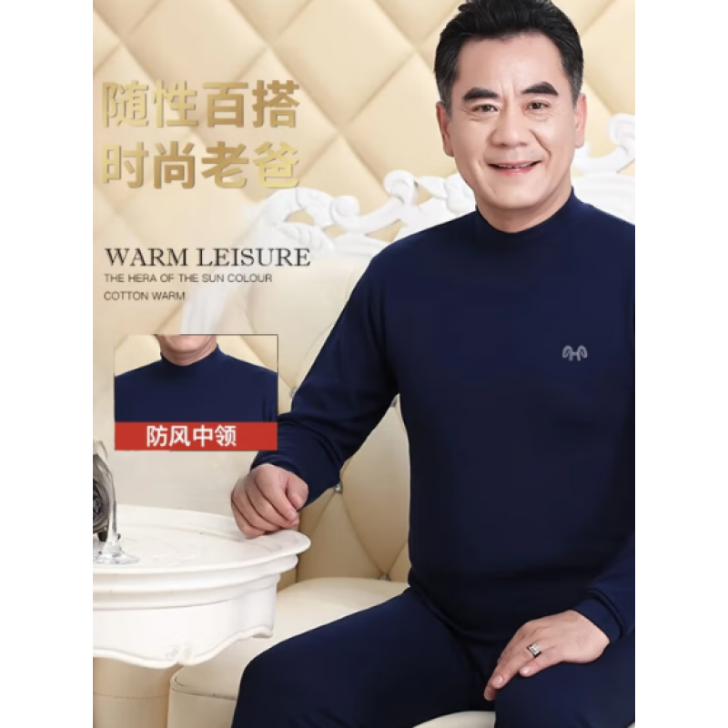 Middle-aged and elderly men's pure cotton thermal underwear set, loose and warm, dad's cotton sweater [windproof high collar]